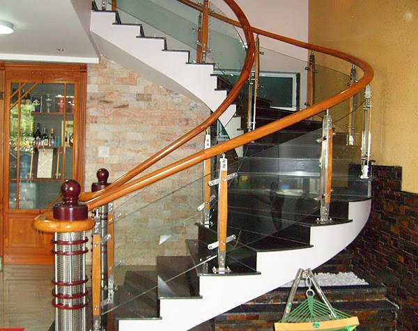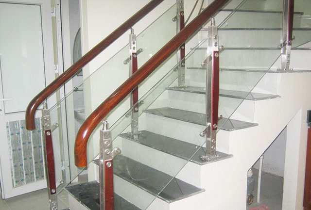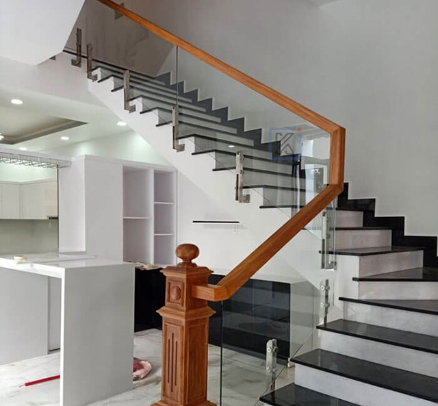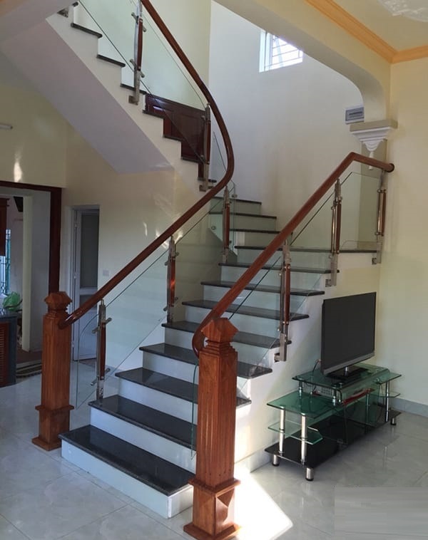 - Tay vịn cầu thang kính dùng chất liệu gỗ Lim Nam Phi hoặc inox trơn đơn giản, không cầu kỳ , kính cường lực dày từ 10 – 12mm.
